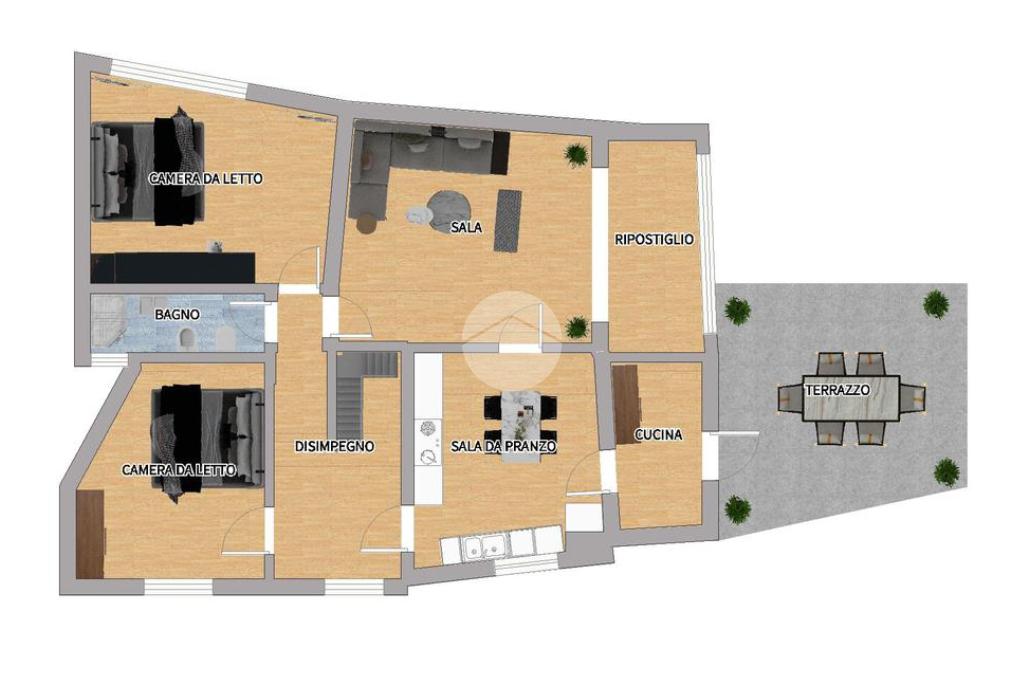 La camera da letto è di generose dimensioni e il salotto permette anch'esso l'uscita sul terrazzo.